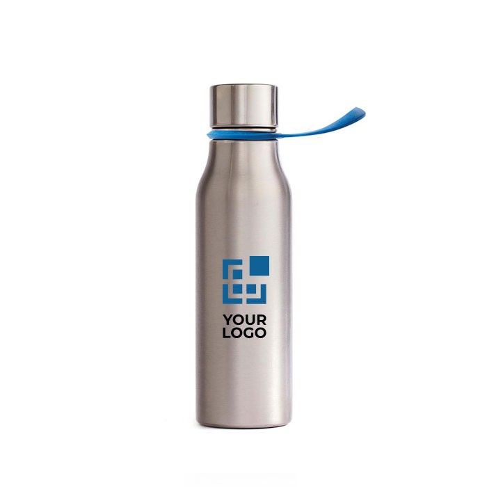 Botella de aluminio metalizada con un toque de color en la cinta. Cuenta con un diseño elegante para transmitir una imagen de profesionalidad de tu marca.