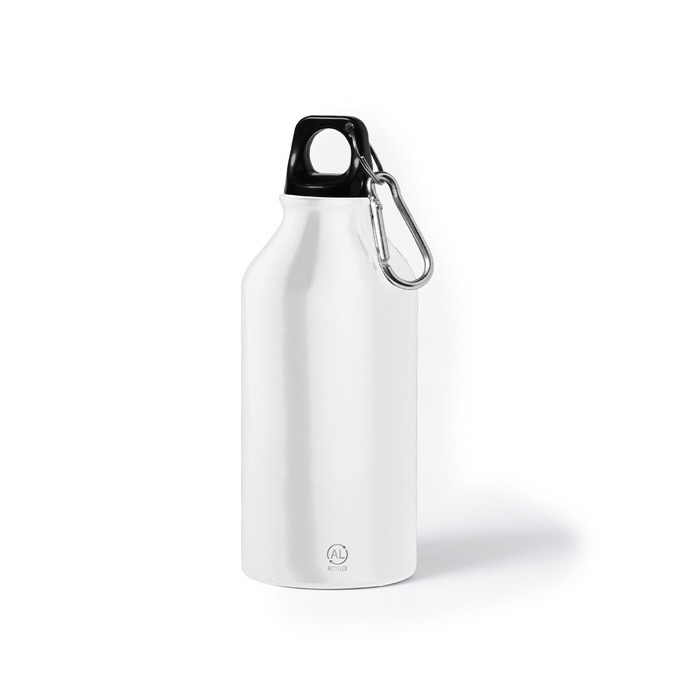 Bidón de 400ml fabricado en aluminio reciclado. De acabado mate, con tapón a rosca en negro, anilla y mosquetón de transporte. Libre de BPA y presentado en caja individual de diseño kraft.