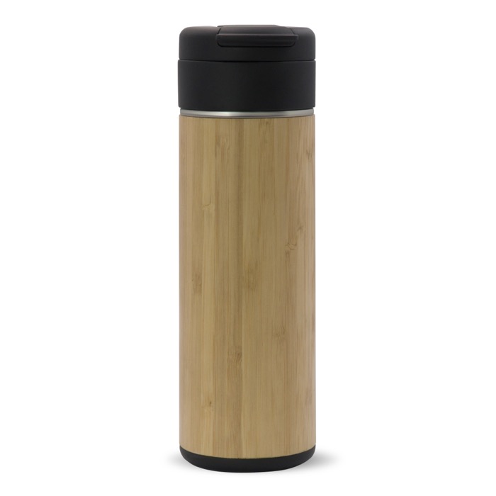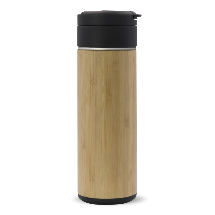 Botella de doble pared con aislamiento al vacío de la serie 'Flow' de Toppoint. Taza con acabado de bambú y tapa abatible, 100% estanca. Mantiene las bebidas calientes hasta 12 horas o frías hasta 24 horas.
