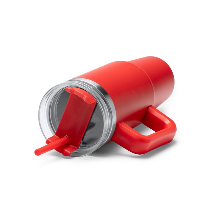 Taza térmica de 870 ml en acero reciclado, con tapa de cierre seguro y pajita integrada. Una opción ideal para campañas de bienestar o sostenibilidad.