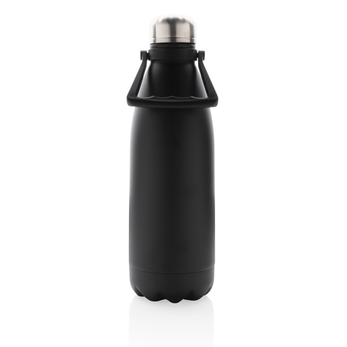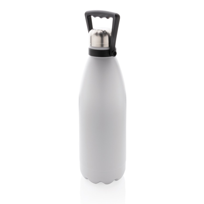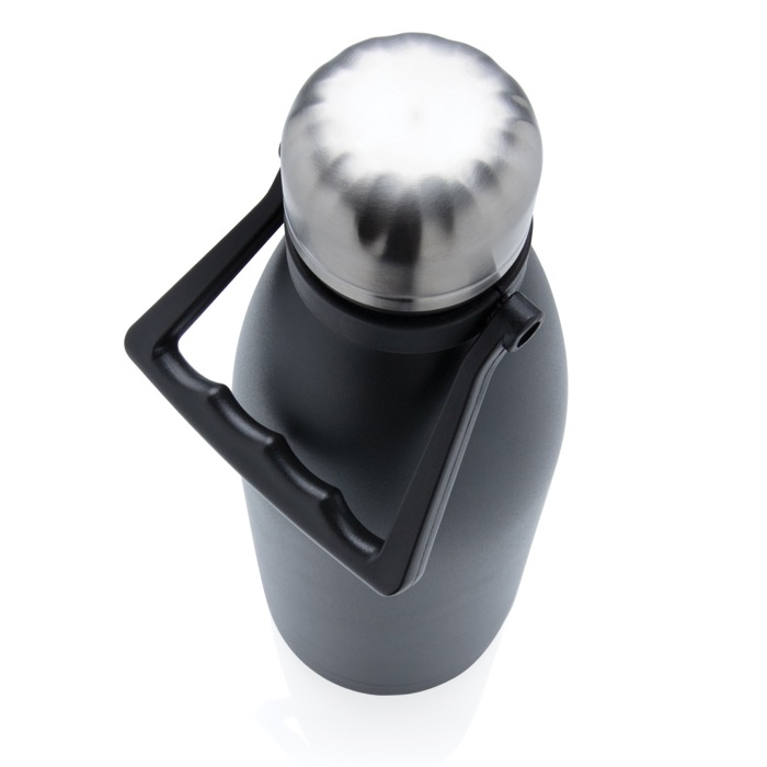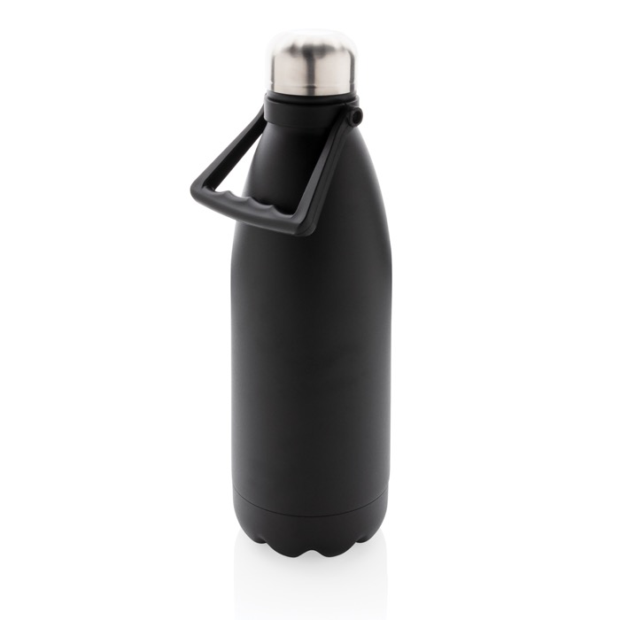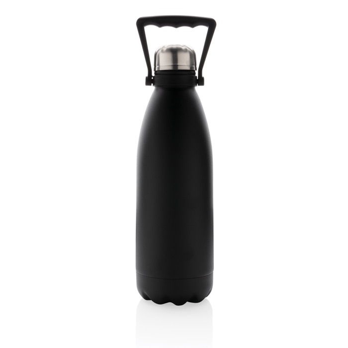 Botella de acero inoxidable de doble pared con capacidad de 1,5 litros. Mantiene bebidas calientes durante 5h o frías durante 15h. Recubierto en polvo con asa para transportarla fácilmente. Fabricado con materiales reciclados certificados RCS. Contenido reciclado total: 88%. Sin BPA. Incluye embalaje kraft certificado FSC®.