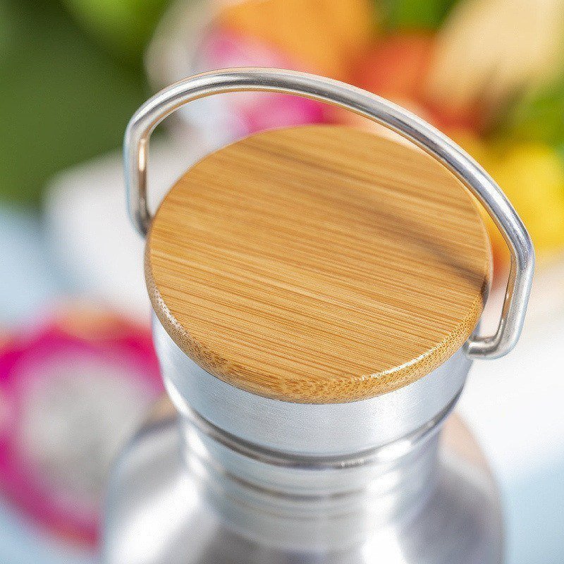 Bidón de 800ml de capacidad. Cuerpo fabricado en acero inoxidable y tapón en bambú con original asa metálica de transporte. Presentado en atractiva caja de diseño eco.