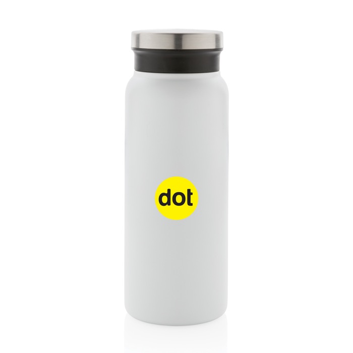 Botella al vacío de acero inoxidable reciclado RCS, con tapa de rosca segura con amplia abertura. La parte adicional de PP asegura que la botella sea hermética. Construcción de doble pared que mantiene las bebidas calientes 5h y frías 15h. Fabricado con materiales reciclados certificados RCS (Recycled Claim Standard). Sin BPA. Capacidad 600ml. Caja de papel kraft con certificado FSC®.