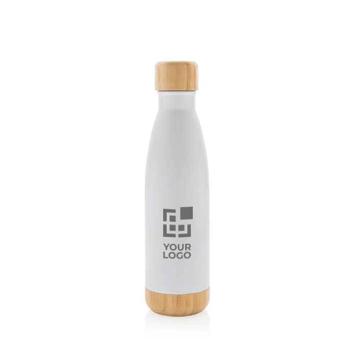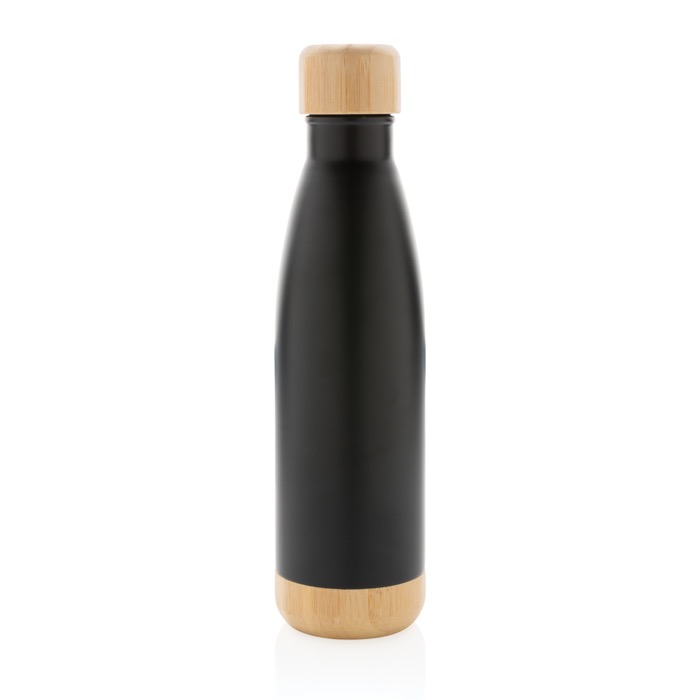 Botella de acero inoxidable al vacío. Cuenta con una tapa de bambú y un detalle en la parte inferior para darle un toque extra de estilo. Capacidad 520ml.
