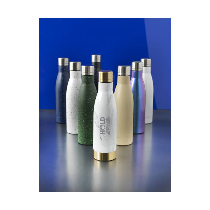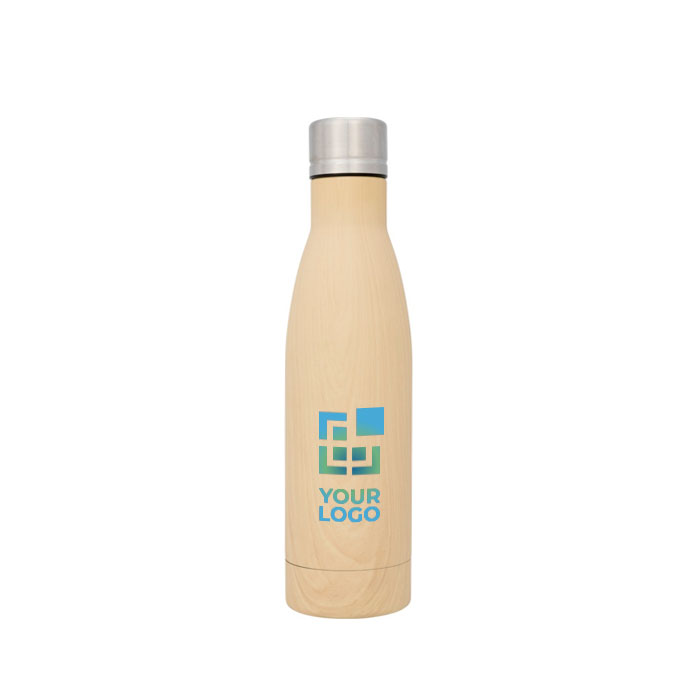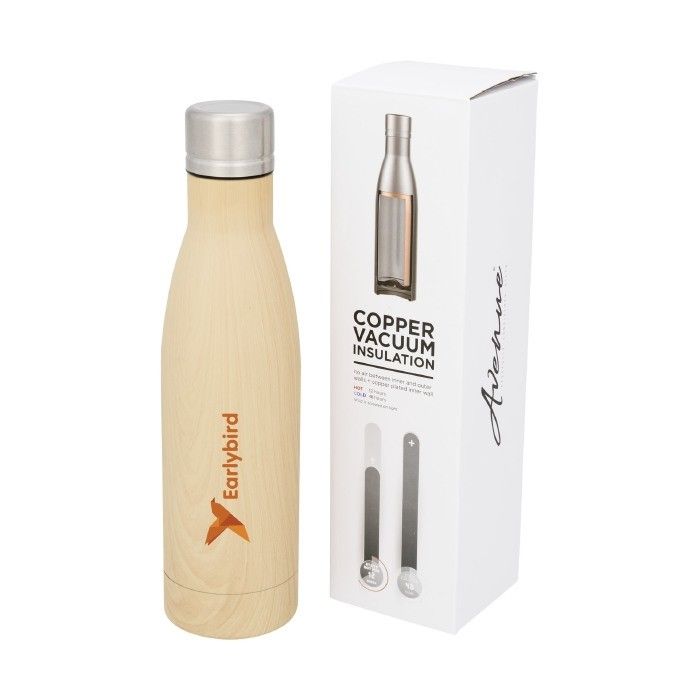 Esta botella promocional permite una función térmica gracias a su estructura, la cual consiste en una doble pared con aislamiento al vacío de cobre e interior de acero inoxidable de grado 18/8. De esta manera, se puede mantener la bebida del interior fría unas 48 horas o caliente máximo 12 horas. Su capacidad es de 500 ml, lo estándar en esta clase de recipientes. Sin embargo, hay que mencionar que lo más destacado de esta botella para publicidad es el hecho de que su cubierta exterior es de madera, suponiendo así un diseño atractivo y diferenciador respecto otros modelos y permitiendo alinearse con identidades corporativas enfocadas hacia la naturaleza. Este regalo de empresa se presenta en una caja Avenue, facilitando así que se perciba como un detalle exclusivo.