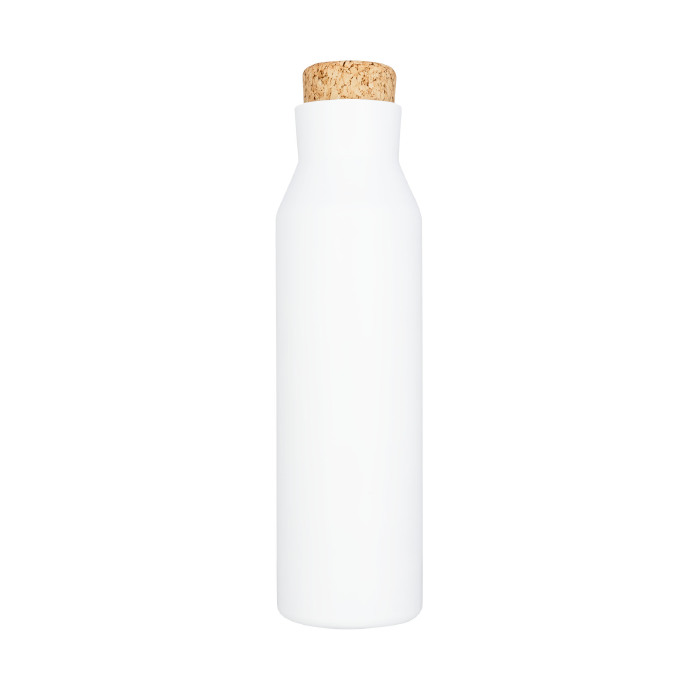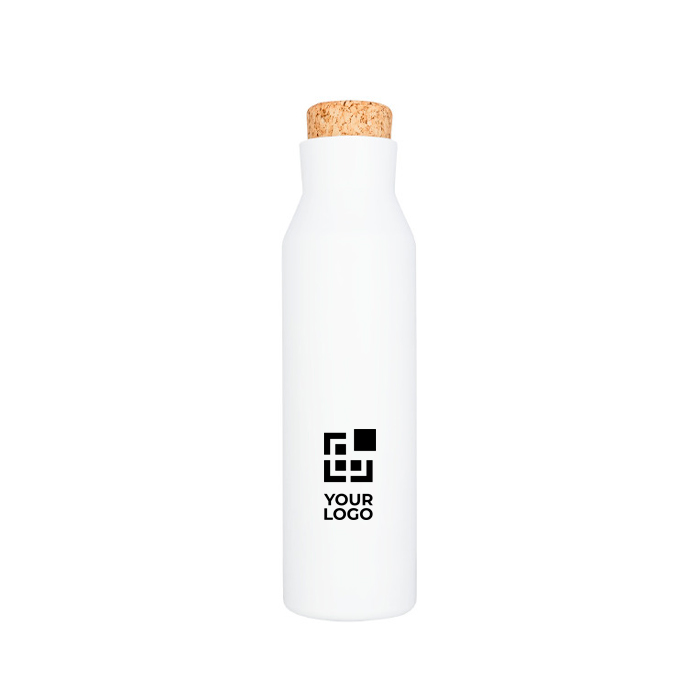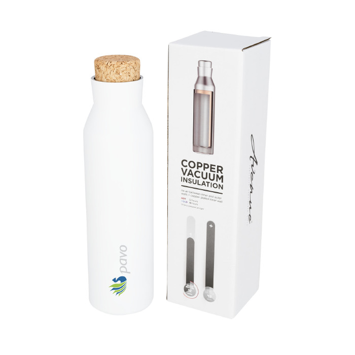 Botellas para publicidad hechas de acero inoxidable de doble pared y que cuentan con aislamiento de cobre. Estas especificaciones permiten que el líquido del interior se mantenga frío durante 48 horas o caliente durante 12. Por cómo está hecha, también se evita la condensación en la parte exterior del recipiente. Cuenta con una tapa antifugas de rosca que emula un corcho. La cantidad que puede contener es de 590 ml y, por su forma, se puede adaptar a muchos portavasos de vehículo. Esta botella es un obsequio publicitario de alta calidad que se presenta en una caja de regalo Avenue, por lo que el valor percibido por quien lo reciba será alto.