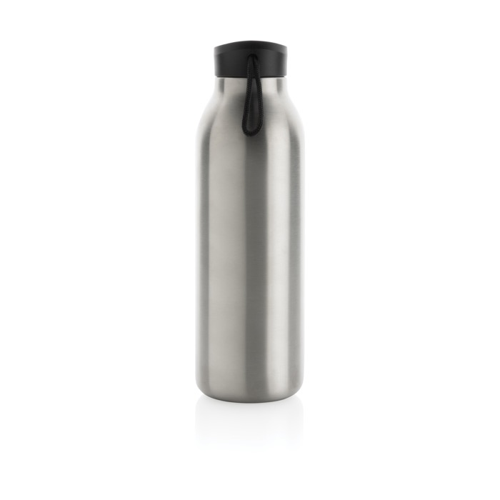 Botella al vacío de acero inoxidable reciclado RCS de doble pared. Mantiene bebidas frías hasta 20h o calientes hasta 10h. Se adapta a la mayoría de los portavasos estándar para automóviles. Fabricado con materiales reciclados certificados RCS. Contenido reciclado total: 97%. Sin BPA. Capacidad 500ml. Incluye embalaje kraft certificado FSC®.