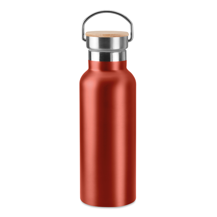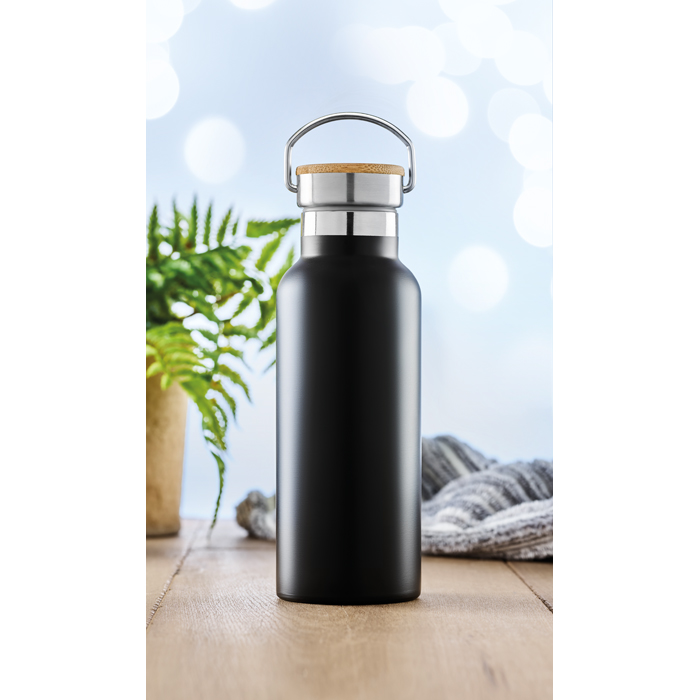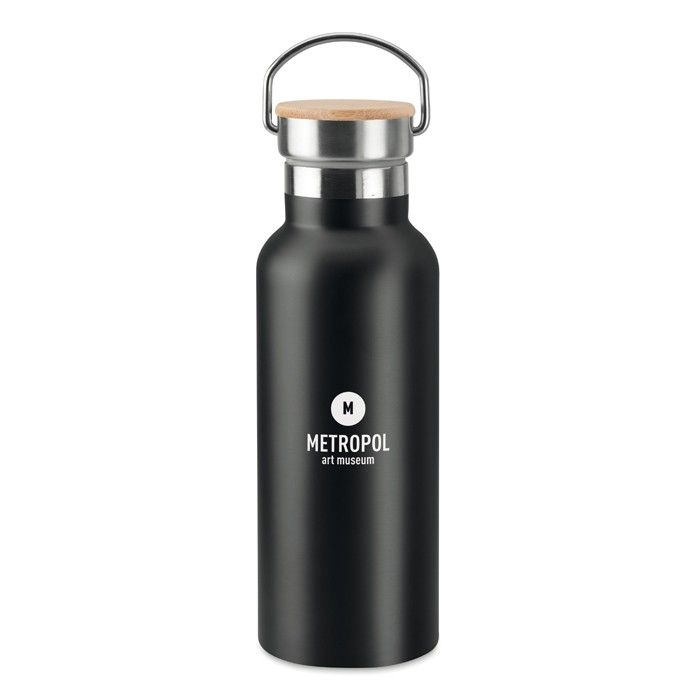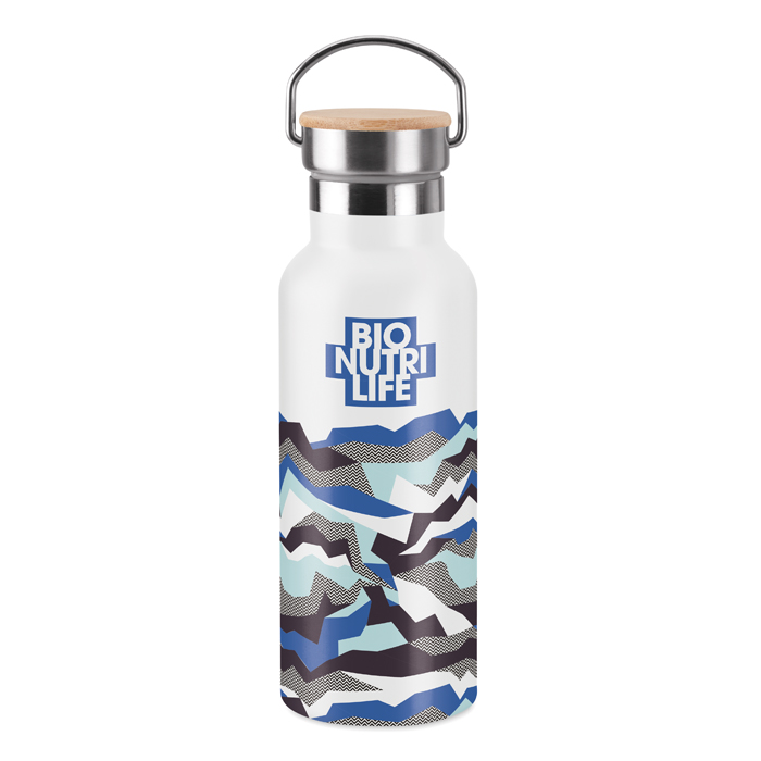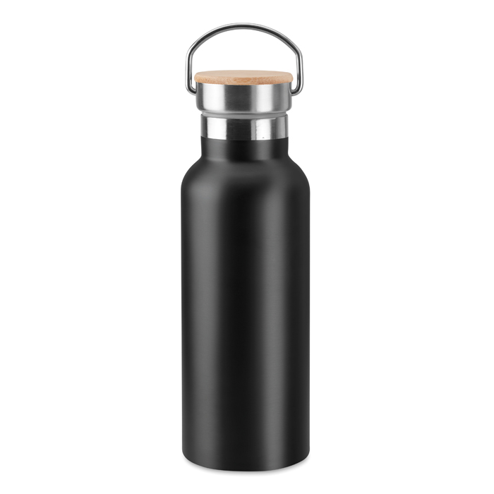 Modelo de botellas térmicas para empresas hechas en acero inoxidable de doble pared, lo cual favorecerá el poder mantener la bebida del interior fría o caliente durante horas. Esta clase de productos de merchandising corporativo son perfectos para regalar tanto a clientes como empleados o, por otro lado, a asistentes a un evento que se celebre. La capacidad de este recipiente es de 500 ml e incorpora una tapa de bambú con asa que le da un toque único y diferenciador en su diseño. Es elegible en distintos colores y tiene la posibilidad de incluir el logo de empresa mediante una gran variedad de técnicas de personalización para alinear el resultado final con la identidad de la marca.