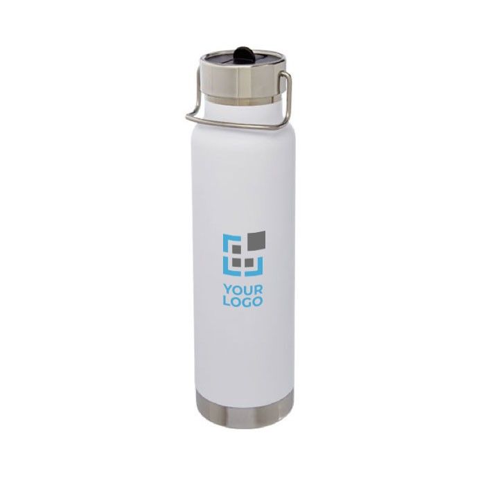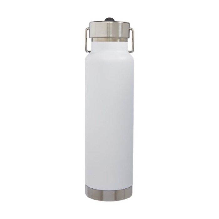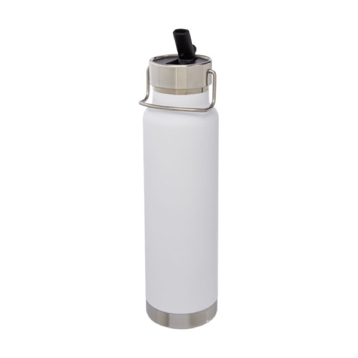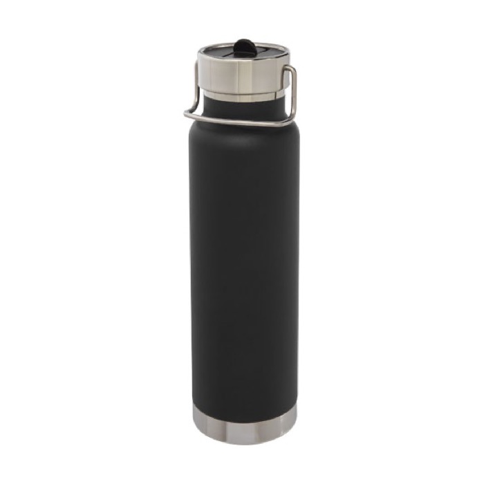 Botella deportiva fabricada al vacío con doble pared de acero inoxidable con aislamiento de cobre que mantiene las bebidas calientes/frías durante horas. Previene la condensación en el exterior y el revestimiento pulverizado hace que sea duradera. Asa y tapa de acero inoxidable, antigoteo, con pajita integrada. Amplia abertura para fácil llenado, vertido y limpieza. Sin BPA, conforme norma alemana LFGB y norma REACH. 750 ml. Se recomienda lavar a mano. Caja de regalo de cartón reciclado.