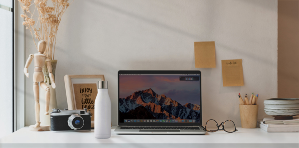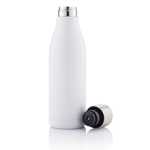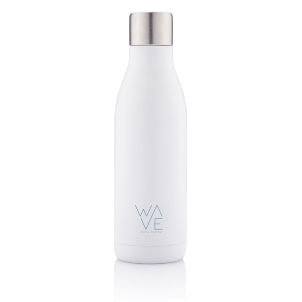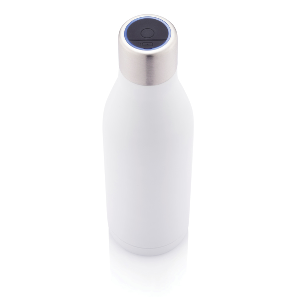Botella de 500ml de acero inoxidable al vacío de doble pared con esterilizador UV-C. Utiliza tecnología inteligente de LED UV-C para limpiar las superficies internas de la botella al eliminar las bacterias y los virus que causan el olor, en aprox. 5 minutos. Mantiene la bebida fría durante 15h y caliente 5h. Viene con batería de polímero de litio recargable USB. Sin BPA.