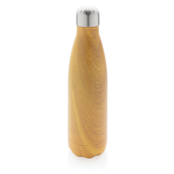 Elegante botella de agua antigoteo de acero inoxidable con aislamiento al vacío de 500ml. La impresión de madera en el cuerpo hace que la botella sea un verdadero punto de atracción. Mantiene las bebidas frías hasta 15h y las calientes hasta 5h. Sin BPA.