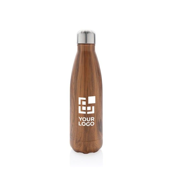 Descubre estas botellas promocionales. Se caracterizan por ser de acero inoxidable, pero cuentan con una impresión de madera.