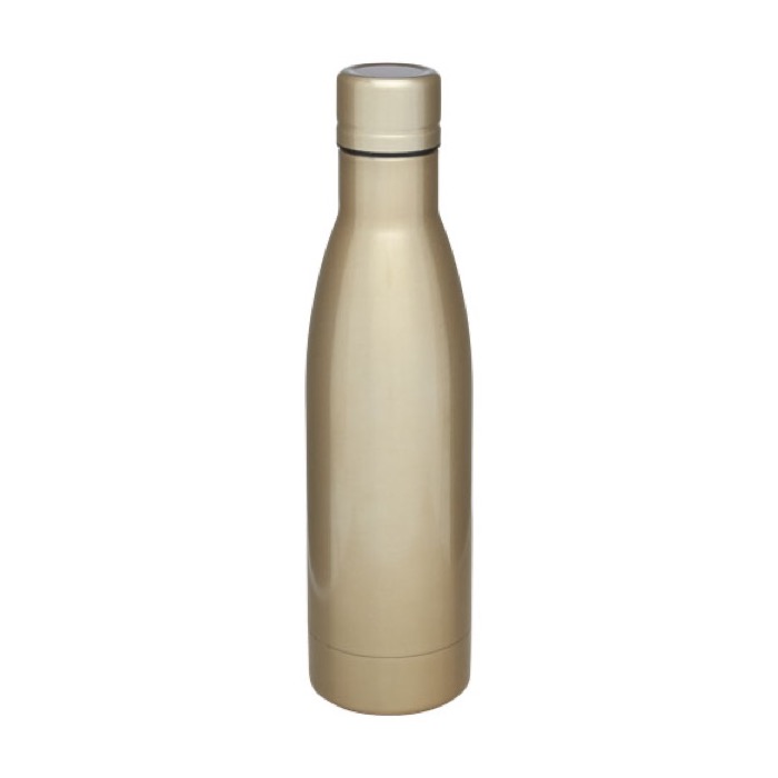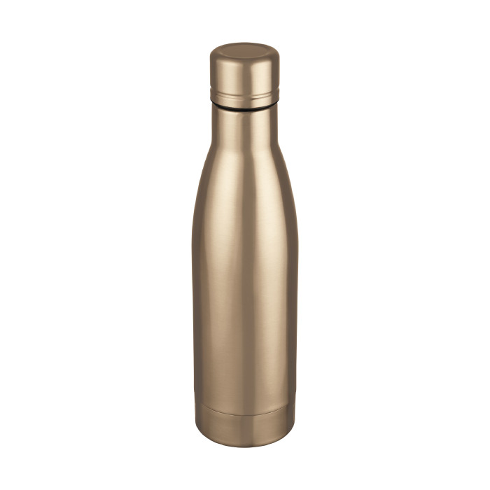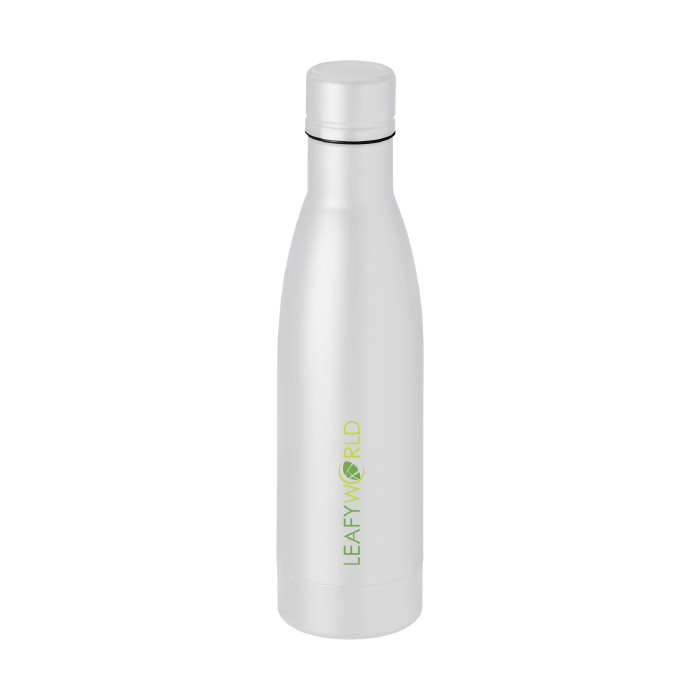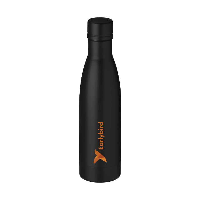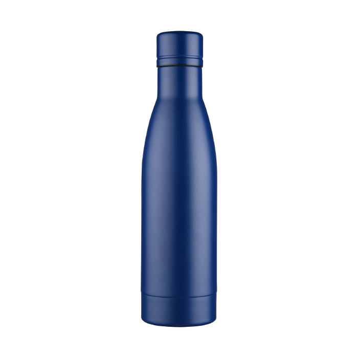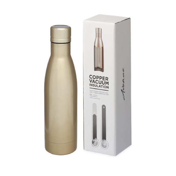 Esta botella personalizada isotérmica está hecha de acero inoxidable con pared doble (de 18/8) y aislamiento por vacío, incorporando cobre plateado en su interior para que las bebidas del interior puedan mantenerse calientes (unas 12 horas) o frías (unas 48 horas), dependiendo de las necesidades personales. El volumen que puede contener es de 500 ml, lo habitual en esta clase de recipientes. Igualmente, se percibe como un regalo de alto valor debido a la calidad de los materiales y a que viene en una caja Avenue. Hay una amplia gama de colores a elegir para la superficie así como distintas técnicas de marcaje para el logotipo que se desee incorporar.