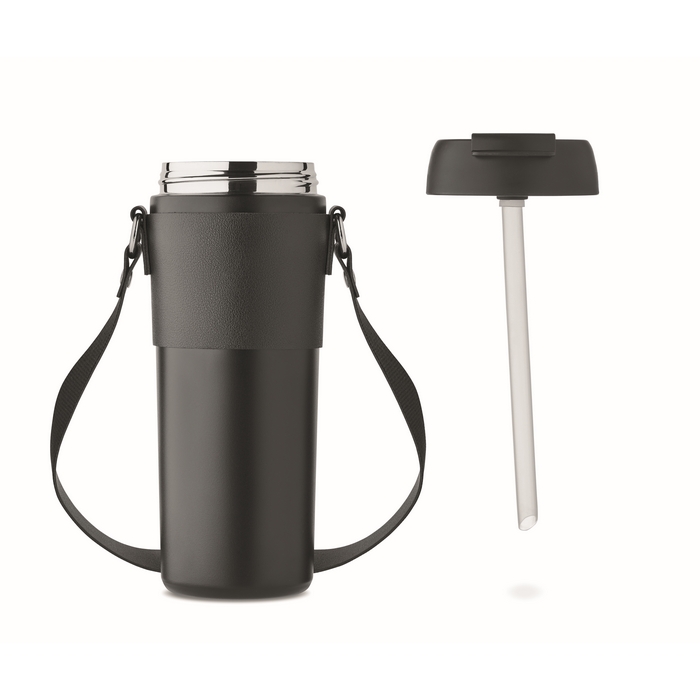 Vaso de acero inoxidable con doble pared y revestimiento en polvo. Incluye una tapa de PP con una pajita 2 en 1 y una correa de PU para facilitar su transporte. Este vaso de 700 ml es totalmente a prueba de fugas.
