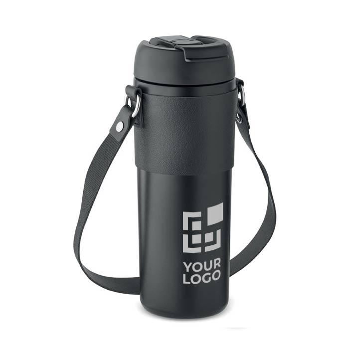 Vasos promocionales de acero, diseñados para un transporte cómodo con tapa y correa, ideales para llevar a cualquier lugar mientras promocionas tu marca.