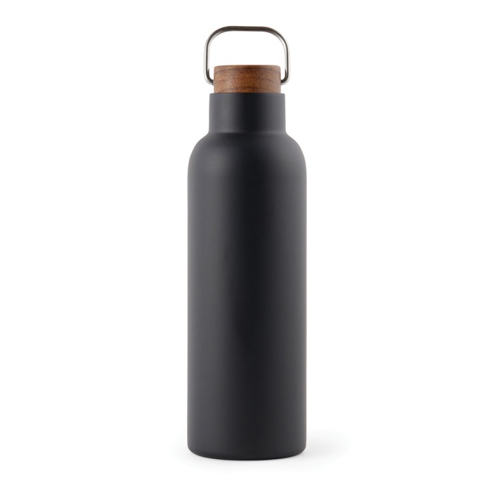 Botella de acero reciclado con tapa de madera de acacia. Un regalo corporativo elegante y sostenible, diseñado para destacar y cuidar el medio ambiente.