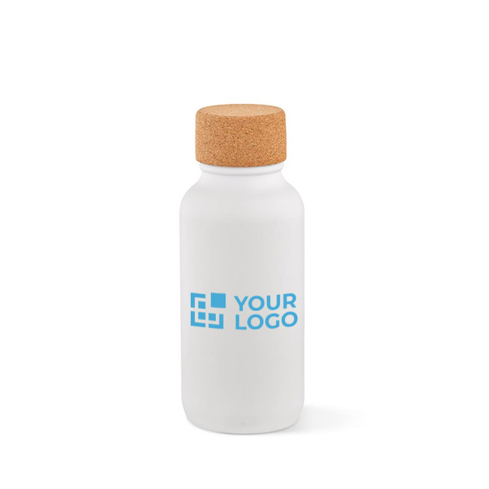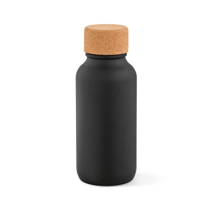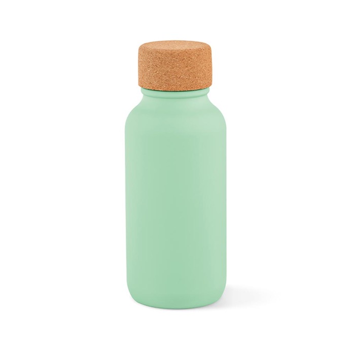 Botella de acero inoxidable reciclado con acabado mate y tapa de corcho. Sostenible, práctica y perfecta para mantenerte hidratado con estilo.