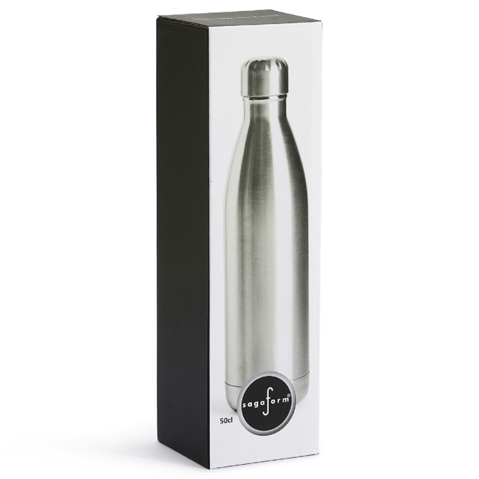 Botella elegante de Sagaform en negro, con aislamiento avanzado de vacío, acero y revestimiento de cobre. Mantiene las bebidas frías hasta 24 horas o calientes hasta 12 horas.