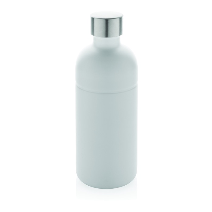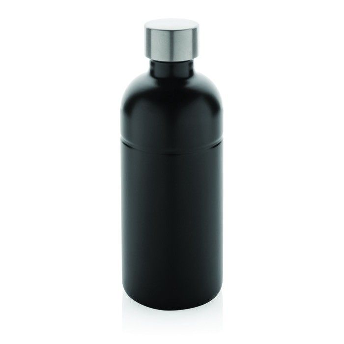 Botella de acero inoxidable reciclado (800 ml), ideal para bebidas carbonatadas y garantizada a prueba de fugas. Hecha con materiales certificados RCS, con un 85% de contenido reciclado, y presentada en embalaje kraft FSC®.
