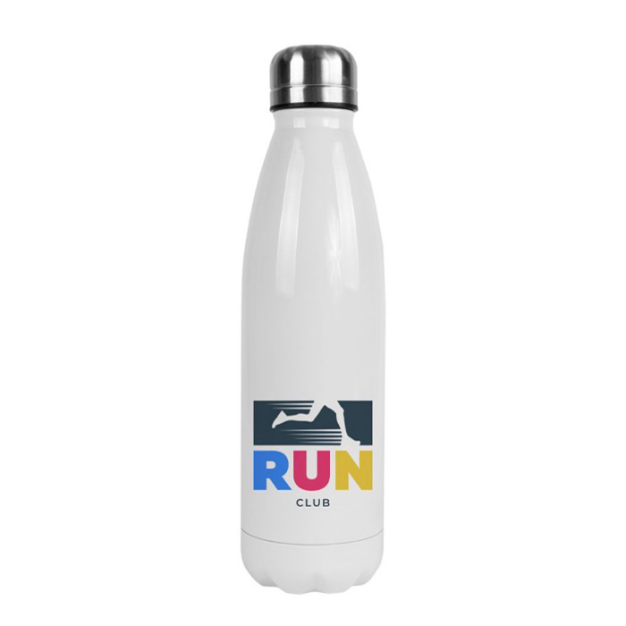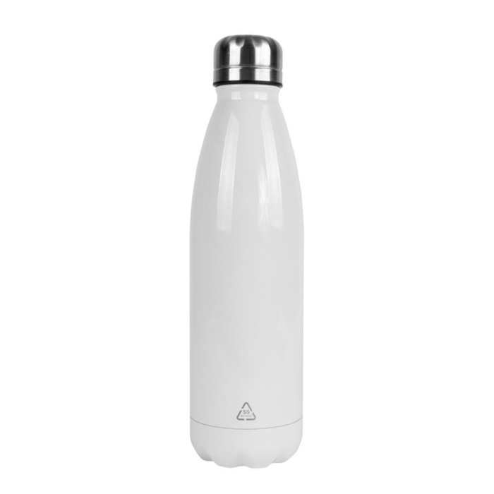 Botella de acero reciclado con acabado especial para sublimación, ideal para personalizar a todo color. Se entrega en caja para una mejor presentación.