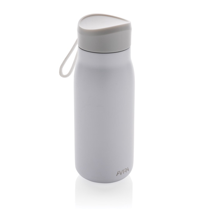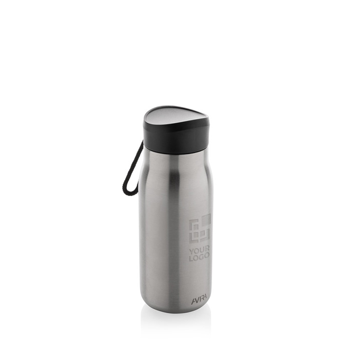 Mini botella de viaje Avira Ain de 150 ml. Ideal para café sobre la marcha, fabricada con materiales reciclados certificados RCS. Viene en caja kraft, reutilizable como soporte para teléfono o portalápices.