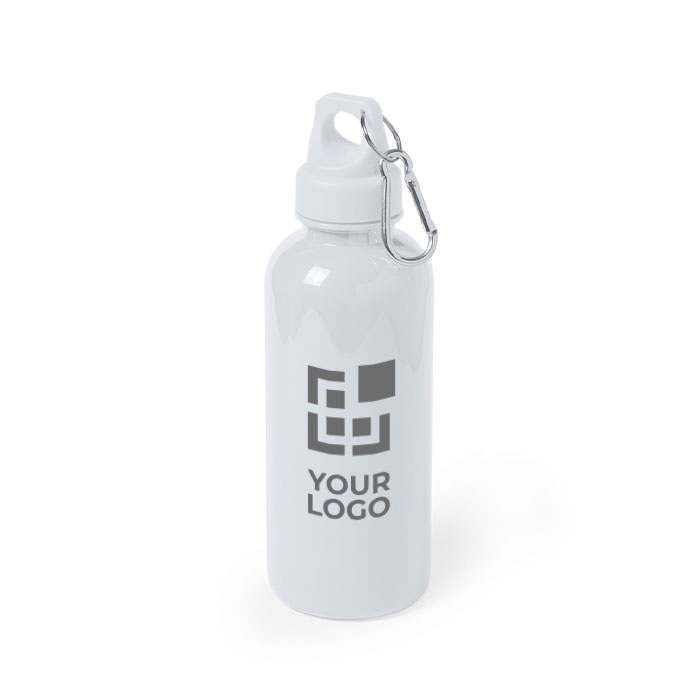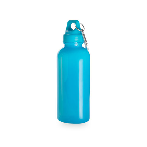 Botella personalizable con tapón de seguridad enroscado, mosquetón metálico de transporte y estructura de PS translúcido disponible en varios colores.