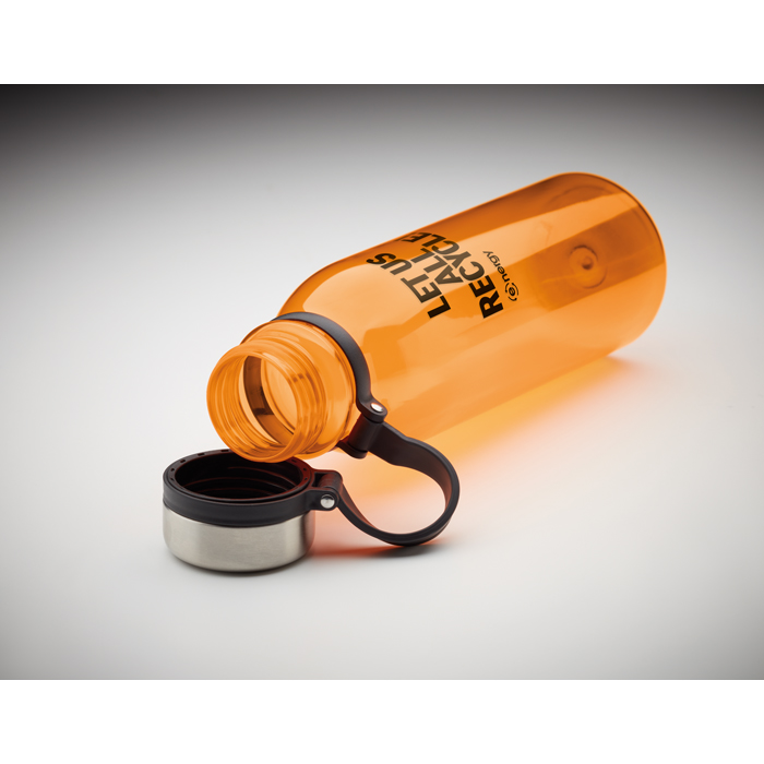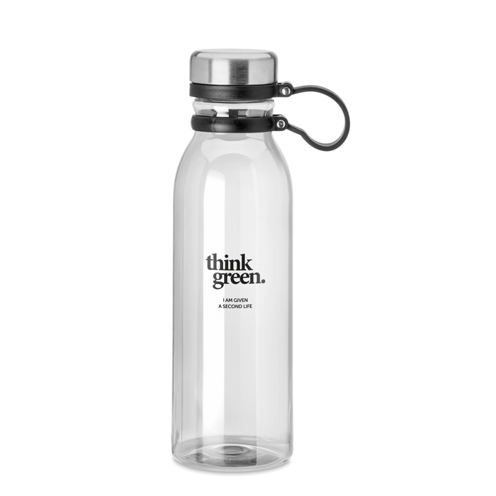 Botella de RPET personalizada con 780 mililitros de capacidad, tapa de acero inoxidable y un asa de TPR para un transporte más fácil y cómoda. Es antifugas y BPA Free.