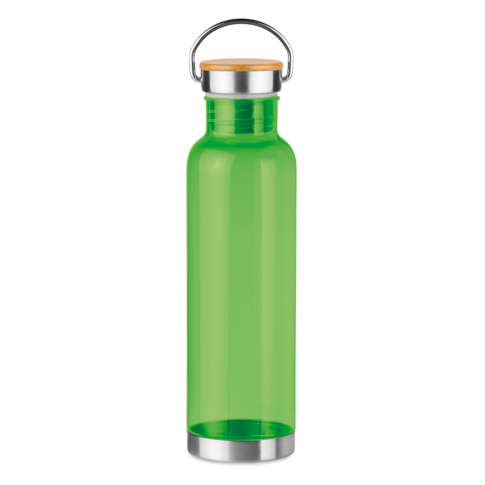 Bidón de tritán con logotipo con base de acero inoxidable y una tapa de bambú con asa. El formato es grande, contando con una capacidad de 800 mililitros. El color del bambú podría variar al ser un material natural.