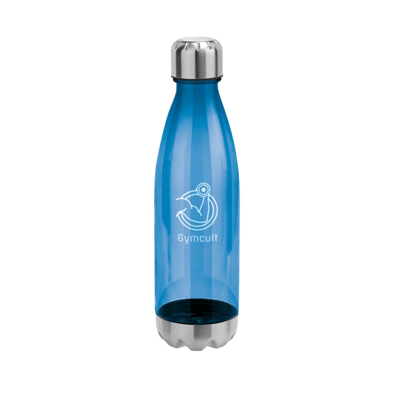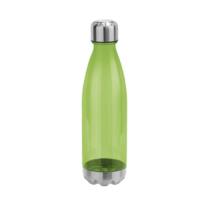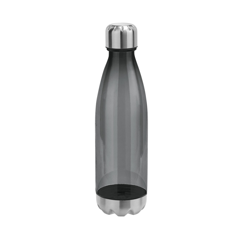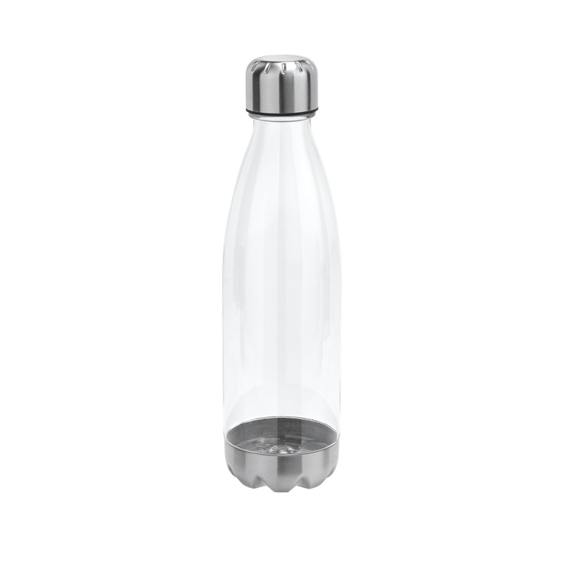 Botella deportiva con base y tapa de acero inoxidable, fabricada en AS. Puede contener hasta 700 mililitros. La tapa tiene el interior en PP y silicona.