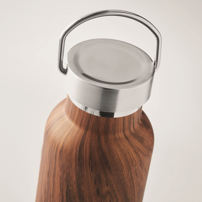 Botella de acero inoxidable reciclado (90% reciclado, 10% acero nuevo) de 500 ml. Doble pared aislada al vacío con diseño de aspecto madera y tapa con asa de transporte. A prueba de fugas.