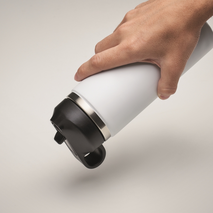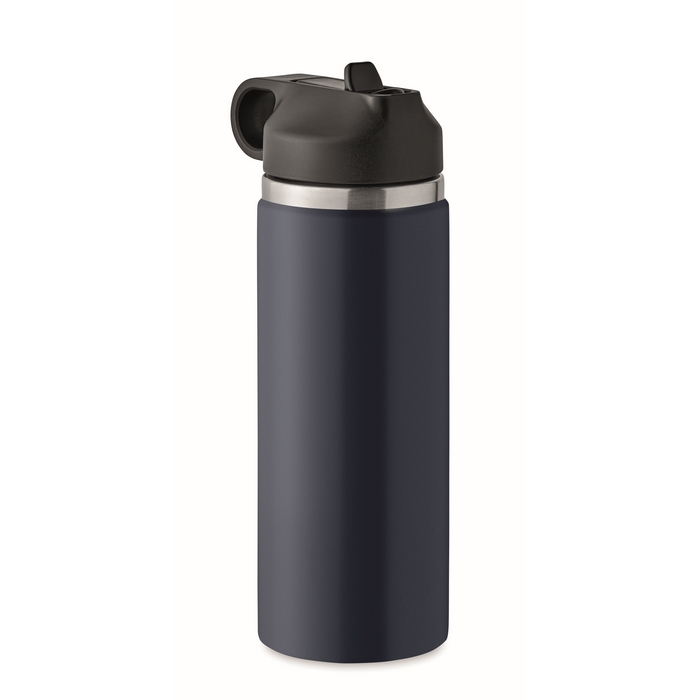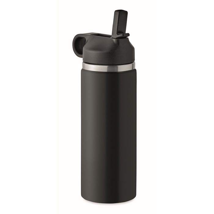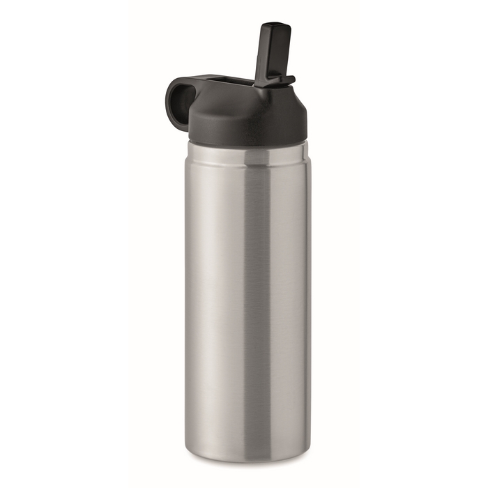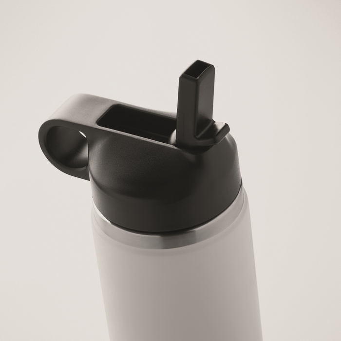 Botella de doble pared aislada de vacío de acero inoxidable reciclado (90% reciclado y 10% acero inoxidable) con tapa con asa de PP y pajita integrada. A prueba de fugas. Capacidad: 500 ml.