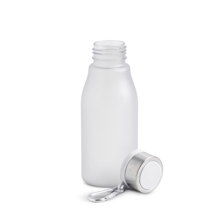 Botella de plástico reciclado de 350 ml con tapa de rosca segura y mosquetón incorporado para un transporte más sencillo y práctico.