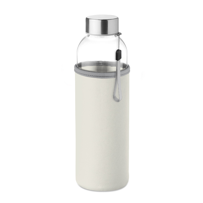 Botellas de cristal personalizadas del tipo Downtown, las cuales incorporan una funda de neopreno a escoger entre diferentes colores, lo cual permitirá una mayor protección del recipiente y, a la vez, que pueda conservar algo de la temperatura del interior en caso de verter en él alguna bebida fría o caliente. Es de estilo deportivo y, por ello, tiene una pequeña correa en el tapón para poder llevarla en la muñeca y que, así, si se está realizando alguna actividad, pueda ir mejor sujeta. Su capacidad es de 500 ml, lo más habitual dentro de esta categoría de botellas con logotipo. Es un regalo ideal para eventos y empresas que estén relacionadas con el ejercicio físico.