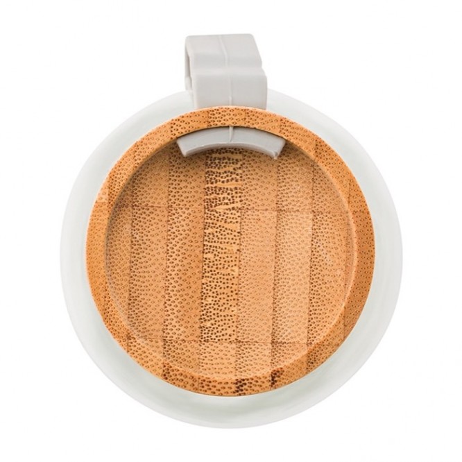 Botella de cristal transparente con un tapón de rosca de bambú. Con este merchandising que tiene un diseño elegante podrás dar visibilidad a tu negocio.