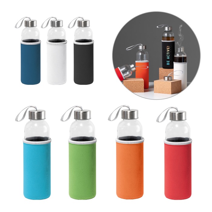 Botella de cristal con tapa de acero y funda softshell, pensada para el día a día en la oficina. También resulta una opción atractiva como regalo promocional.