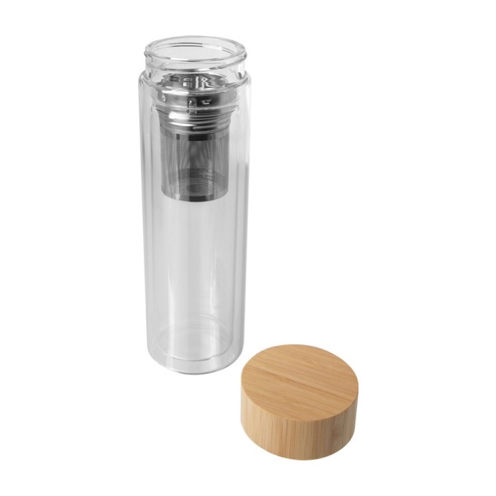 Botella de vidrio borosilicato con infusor de té y tapa de bambú 420ml