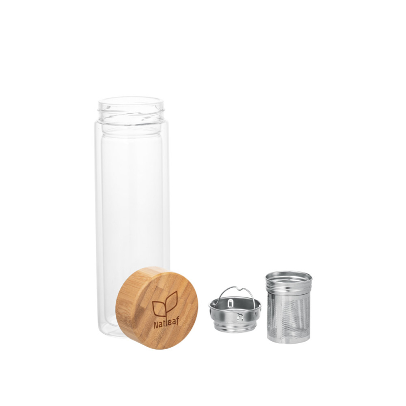 Botella de vidrio borosilicato que cuenta con doble pared y dos infusores de acero inoxidable. Puede contener hasta 490 mililitros. Dispone de tapa de bambú, la cual se deberá retirar si se quiere limpiar en lavavajillas. Presentado en caja de papel kraft.