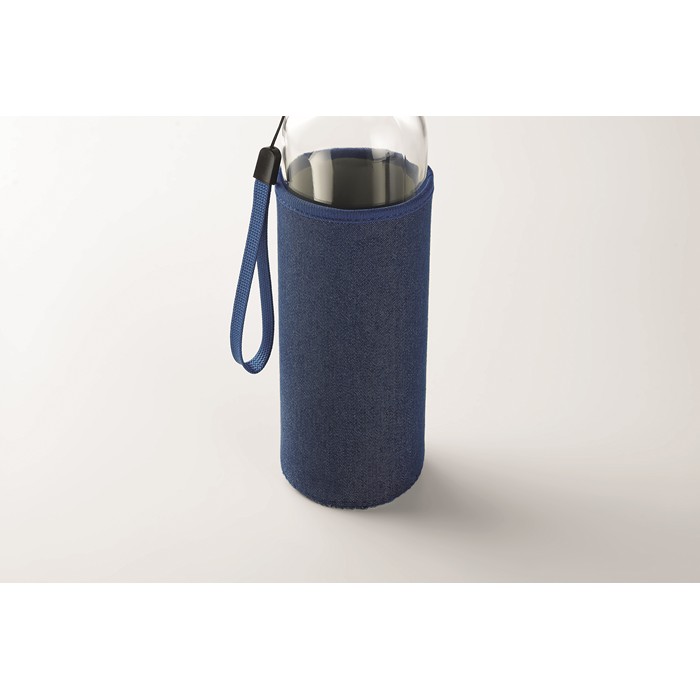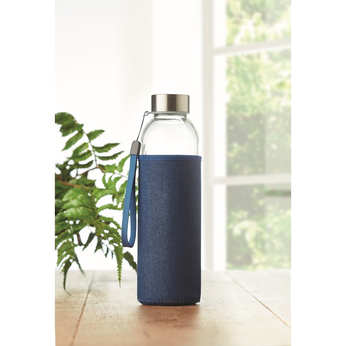 Botella de cristal de 500 mililitros de capacidad, la cual no es apta para bebidas gaseosas pero cuenta con una funda de neopreno efecto denim. Es antifugas.