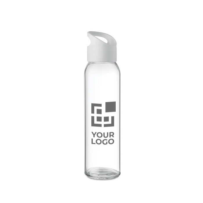 Este tipo de botellas de cristal personalizadas son perfectas para el día a día en la oficina ya que se evitan muchos viajes a la máquina de agua y usar vasos de plástico desechables, evitando así un impacto negativo en el medio ambiente. Además, este recipiente es elegible en distintos colores por lo que, si se junta con el hecho de poder poner el logotipo de empresa en él, estaremos contando con un accesorio publicitario completamente identificado con la imagen de la marca. Esta botella personalizada tiene una tapa de PP con un asa para colgar y, además, su capacidad es de 470 ml.