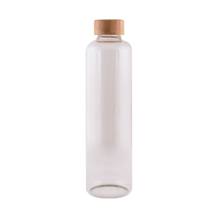 Botella de 1 litro en borosilicato de alta calidad, con tapón de bambú. Resistente y ligera, ideal para mantener tus bebidas frescas y sabrosas durante todo el día. Perfecta para personalizar.