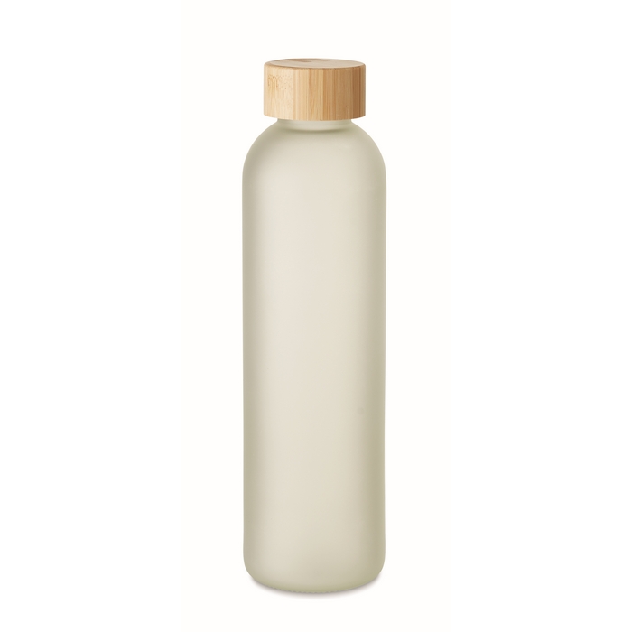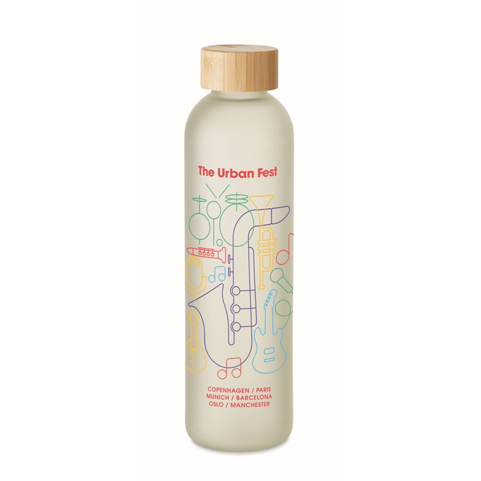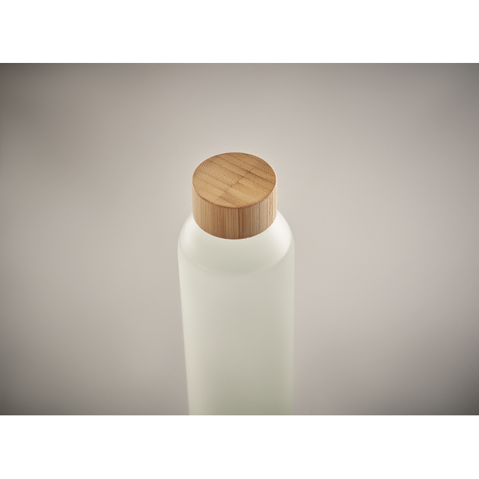 Botella de vidrio de 650 ml con revestimiento especial para sublimación y tapa de bambú. El bambú es un material natural, por lo que el color puede variar, añadiendo un toque único a cada botella.