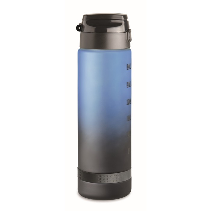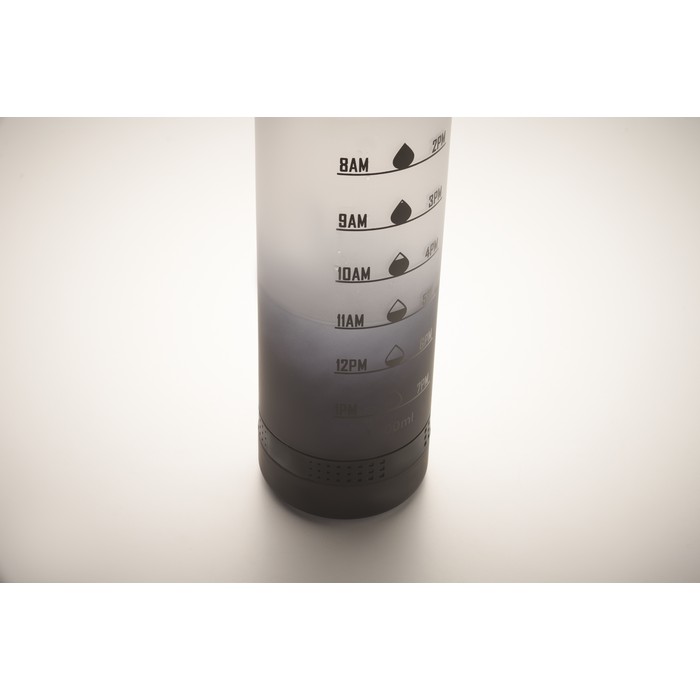 Botella promocional con marcas horarias para controlar la ingesta de agua. Una opción sostenible que ayuda a fomentar hábitos de hidratación saludables.