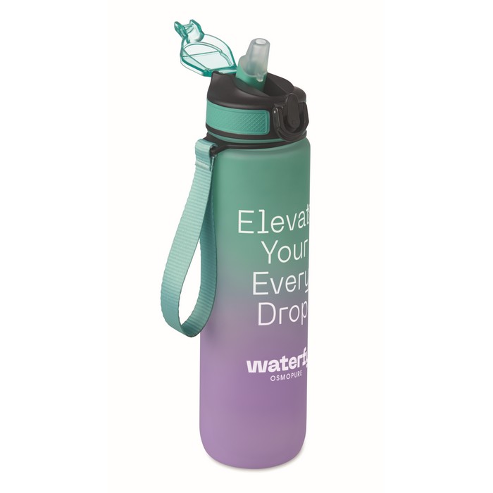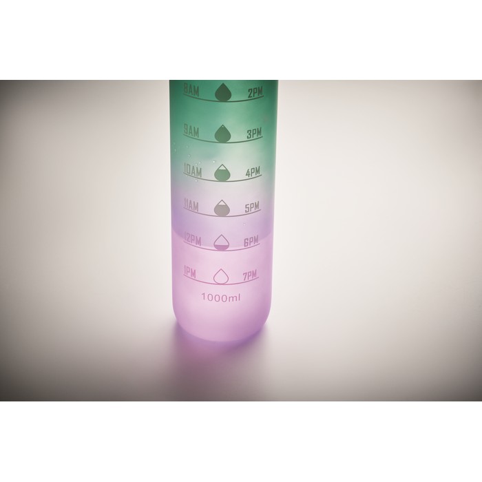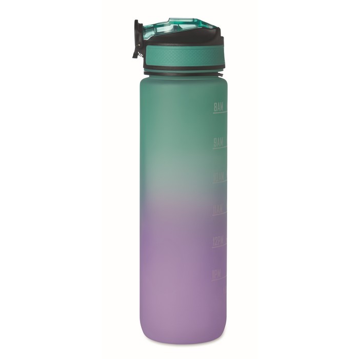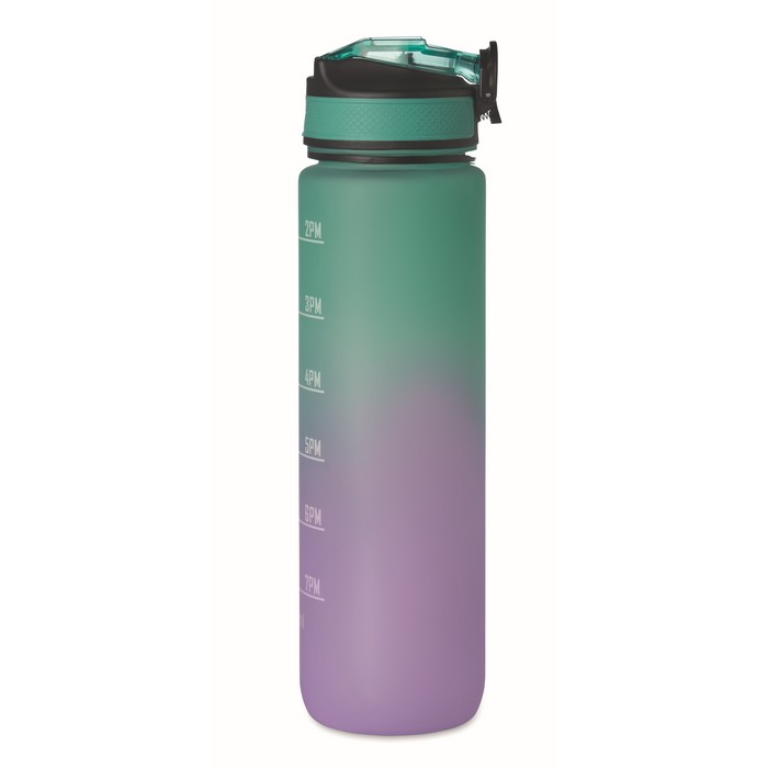 Botella personalizada de 1 L con indicador de tiempo para recordar la ingesta de agua. Una opción práctica que asegura la hidratación durante toda la jornada.