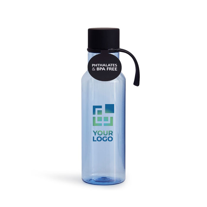Botella de agua elegante y práctica fabricada en plástico Tritan sin BPA. Su tapa de acero inoxidable recubierta de caucho negro asegura un buen agarre, y el lazo permite colgarla cómodamente. Personalízala con tu propio diseño.
