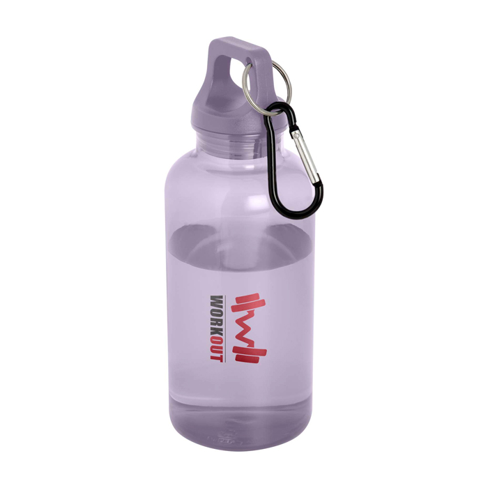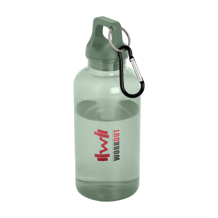 Botella de 400 ml de plástico reciclado, ligera y resistente, con tapa de rosca y mosquetón para transporte. Ideal para personalizar y fácil de llevar, con seguridad alimentaria conforme a normativas alemanas y REACH.