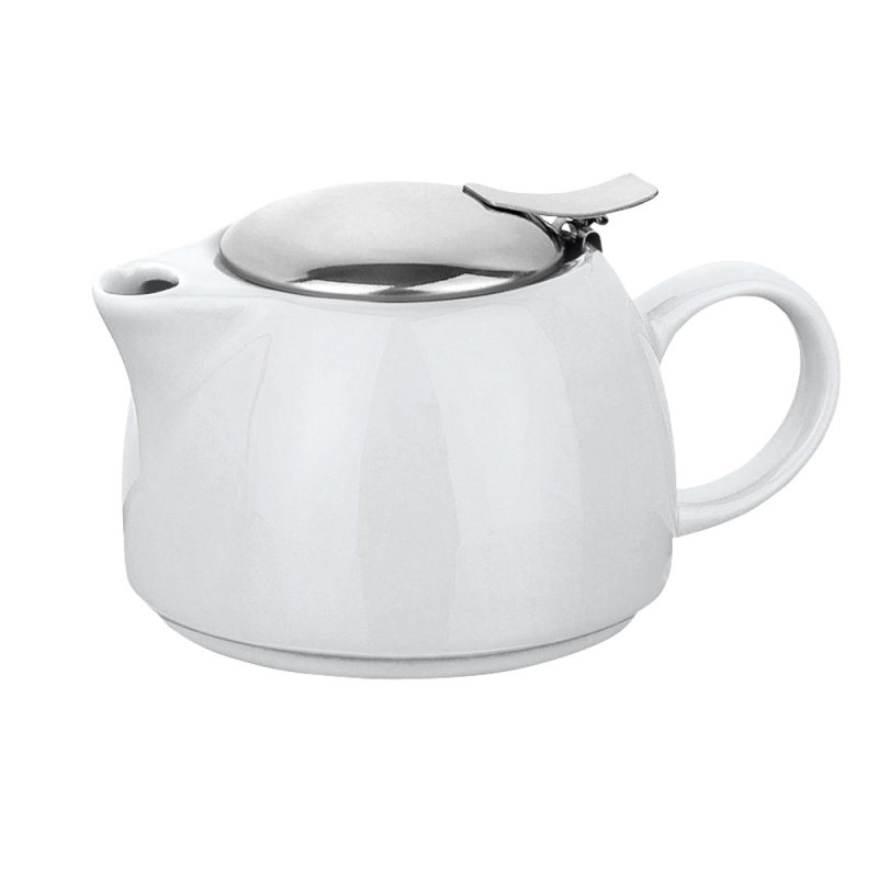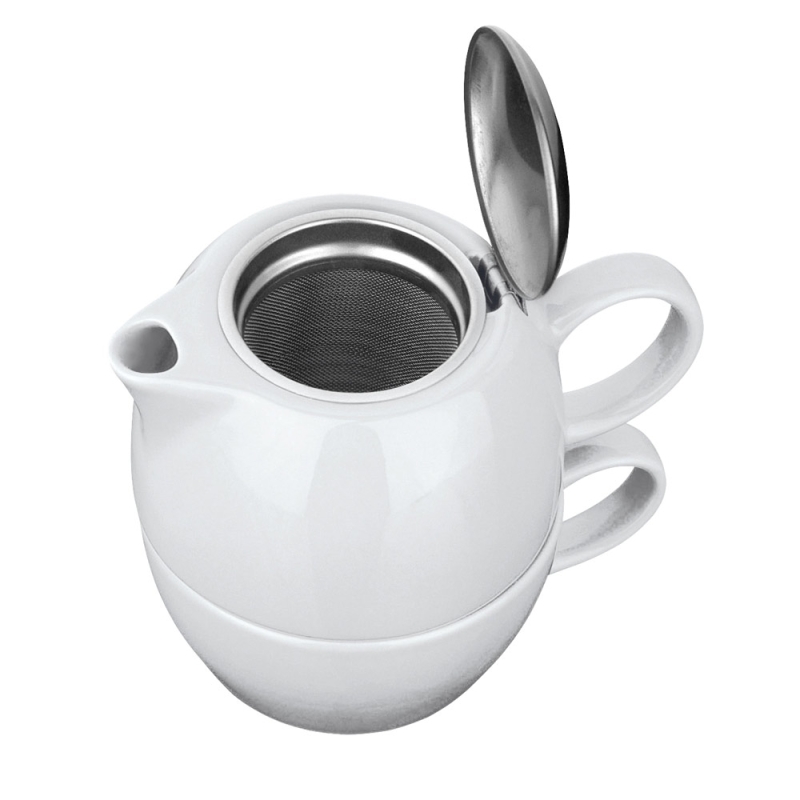 Juego de té hecho de cerámica. Se incluye la tetera (puede contener 430 mililitros) con colador de acero inoxidable y una taza de 260 mililitros.