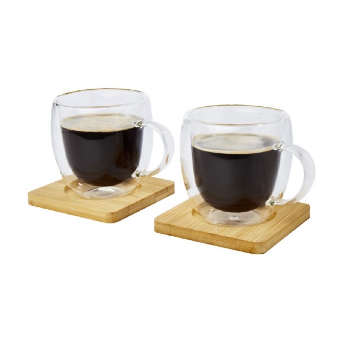 Juego de dos tazas de vidrio para café y posavaso de bambú 250ml