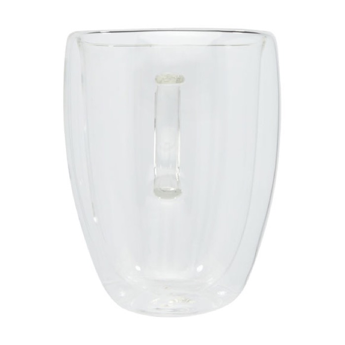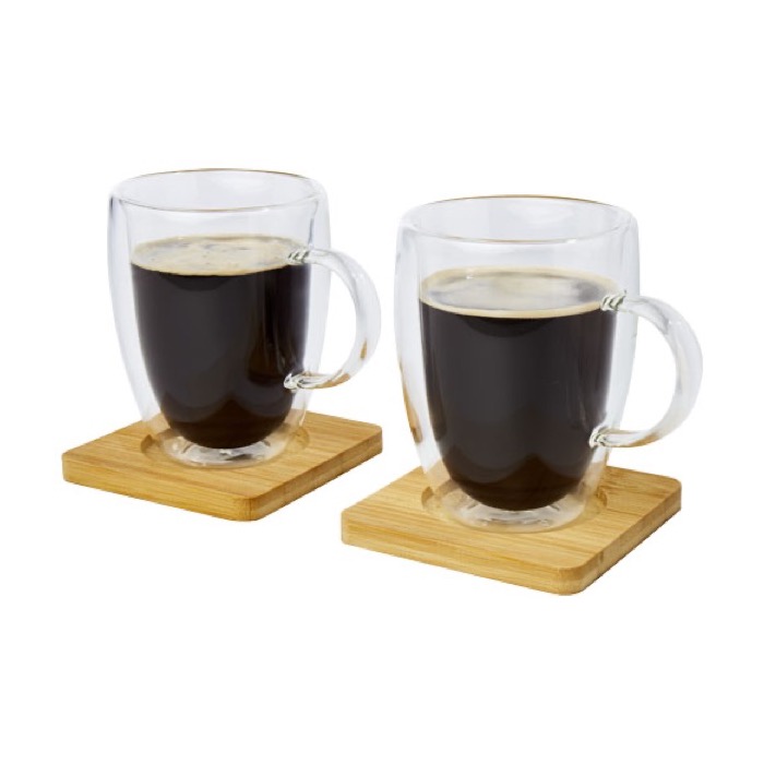 Set de 2 tazas de vidrio promocionales con posavasos de madera 350ml