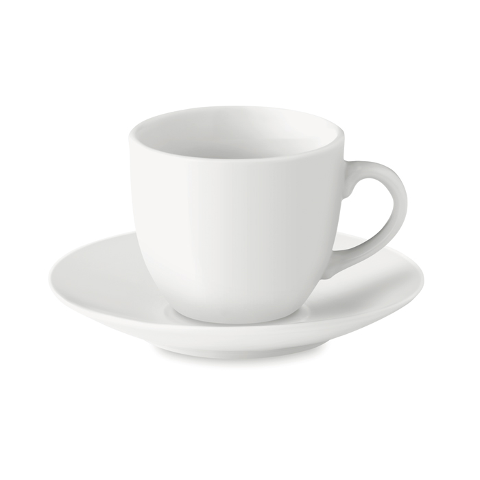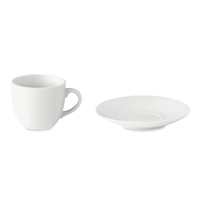 Tazas de café con plato de tipo espresso, contando con 80 mililitros de capacidad. El embalaje es a granel. Marcaje apto para lavavajillas.