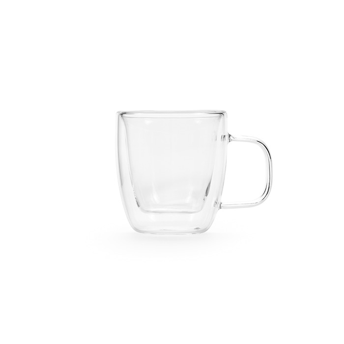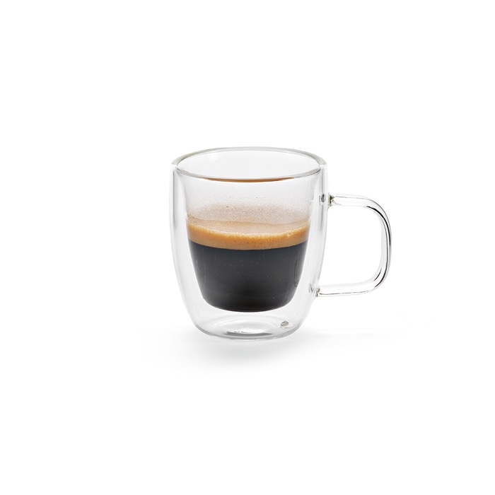 Taza de cristal de 65 ml (50 ml líquidos), elaborada en vidrio de borosilicato. Su diseño de doble pared mantiene el expreso caliente. Perfecta para disfrutar del café matutino, presentada en caja individual.